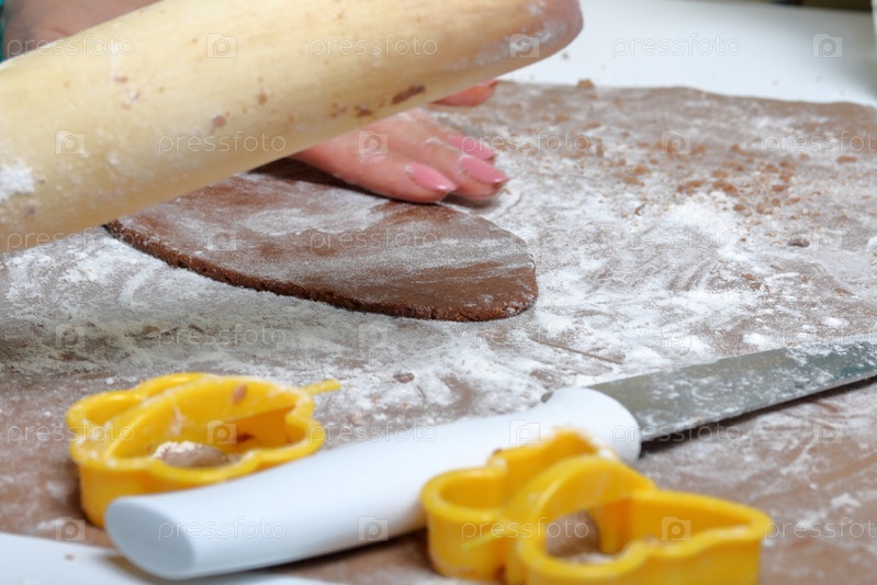 Женщина держит заготовку пряника. Рабочая поверхность в муке, рядом лежат инструменты. Готовим пряники
