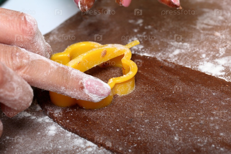 Женщина формирует пряники с помощью пластиковой формы на раскатанном тесте. Рабочая поверхность в муке, рядом лежат инструменты. Готовим пряники