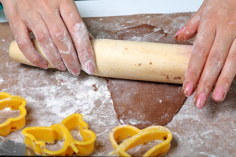 Женщина держит заготовку пряника. Рабочая поверхность в муке, рядом лежат инструменты. Готовим пряники