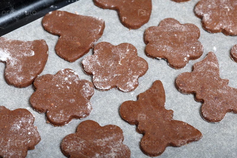 Заготовки для пряников лежат на противне. Посыпанный мукой. Готовим пряники