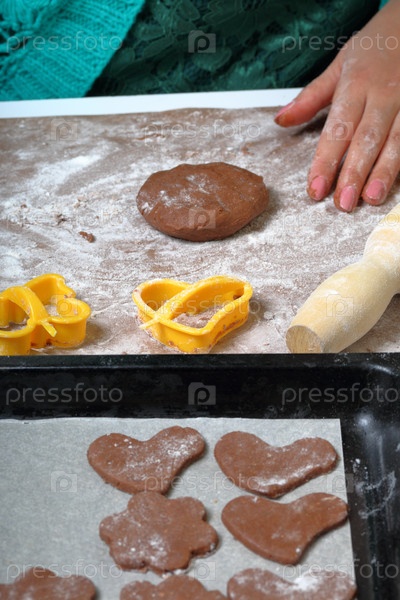 Перед женщиной комок теста для раскатывания. Рабочая поверхность в муке, рядом лежат инструменты. На противне форма для запекания. Готовим пряники
