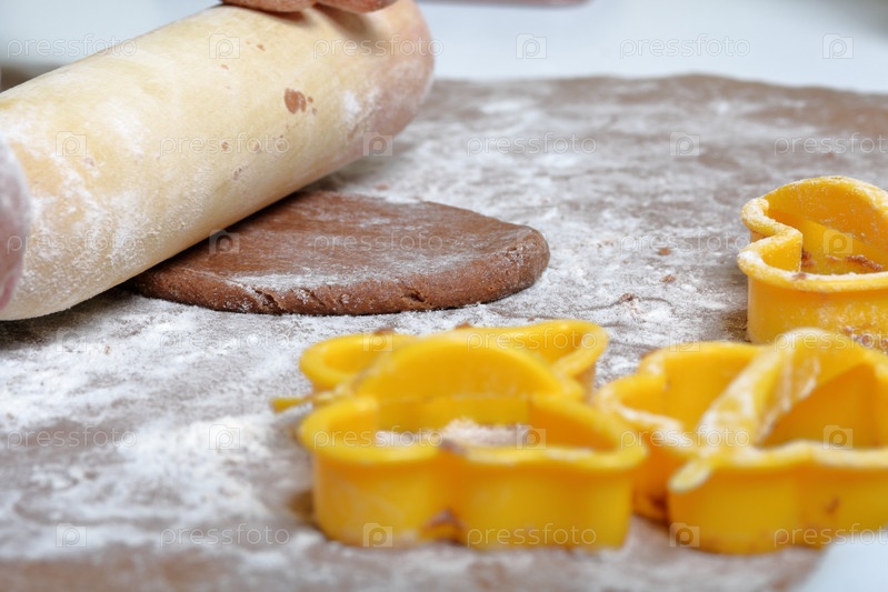 Женщина раскатывает тесто скалкой. Рабочая поверхность в муке, рядом лежат инструменты. Готовим пряники