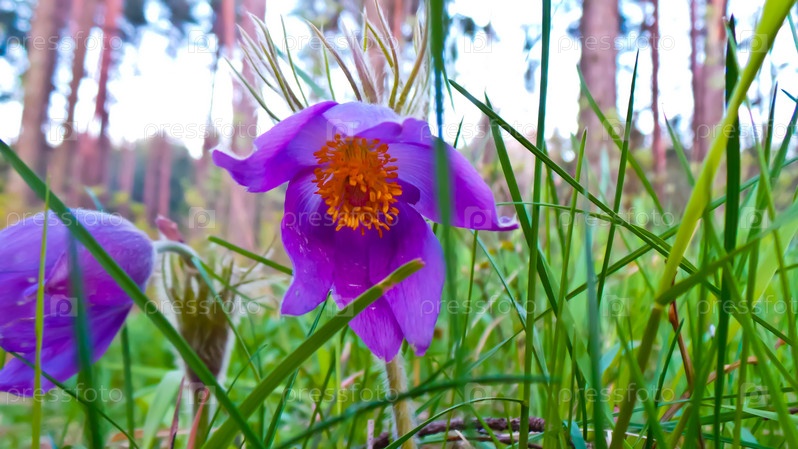 Весенний пейзаж крупным планом.Прострел раскрытый Растение