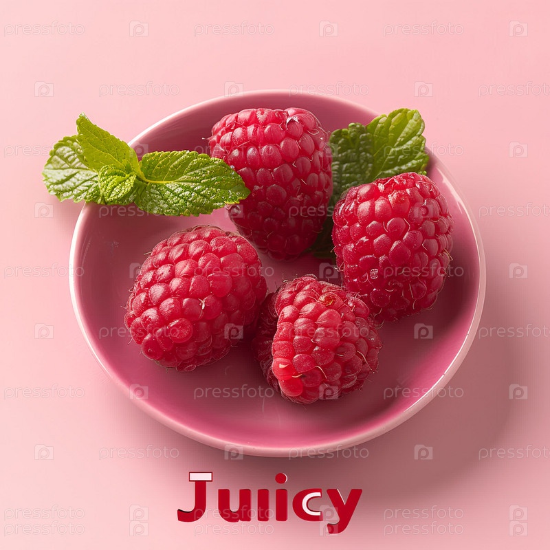 Малиновая ягода на светло-розовом фоне, надпись ниже "Сочная"