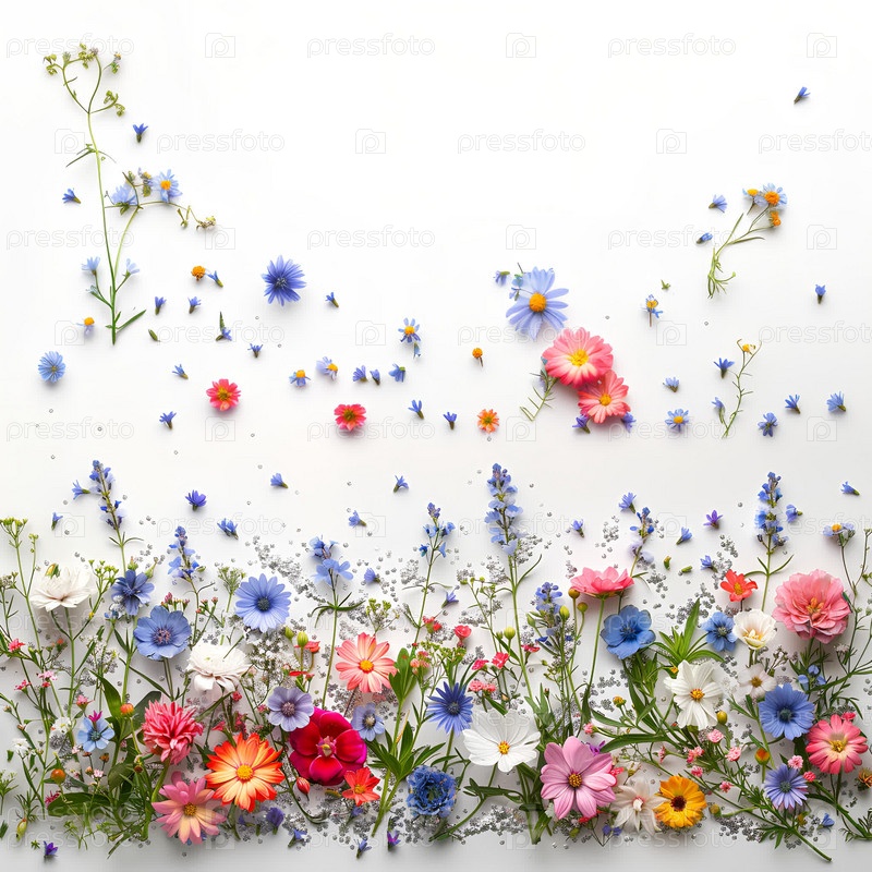 Летний декор из полевых цветов и серебряных искр на светлом фоне