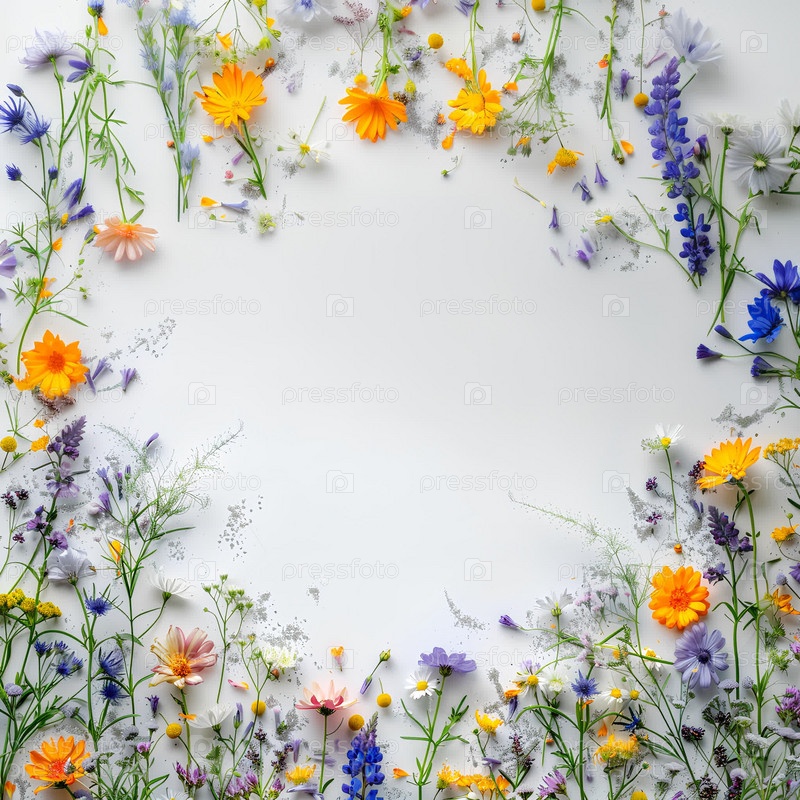 Летний декор из полевых цветов и серебряных искр на светлом фоне