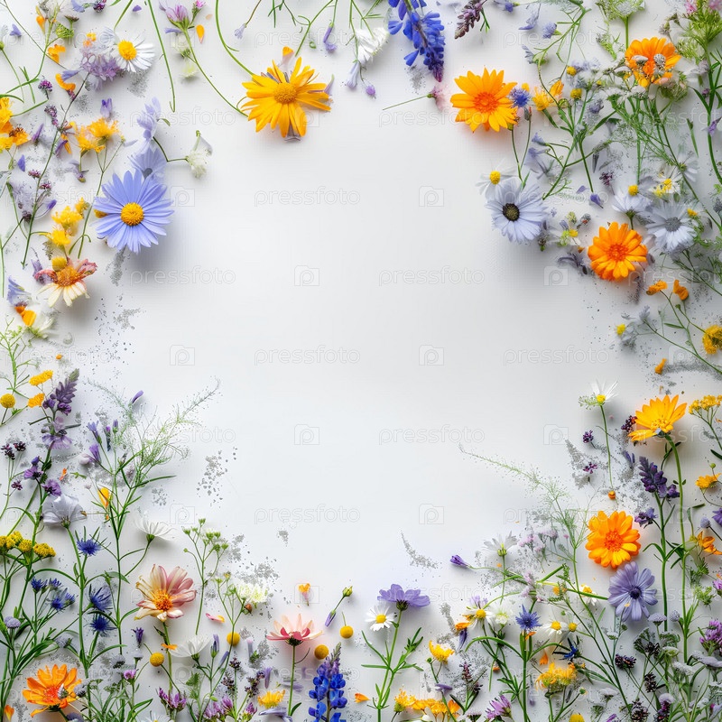 Летний декор из полевых цветов и серебряных искр на светлом фоне