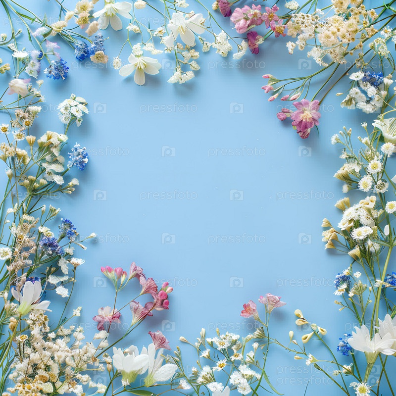 Рамка для текста поздравления с цветами на синем фоне. Открытка в естественных цветах