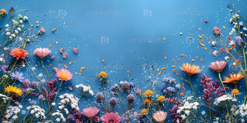 Летний декор из полевых цветов и серебряных искр на синем фоне. вид сверху