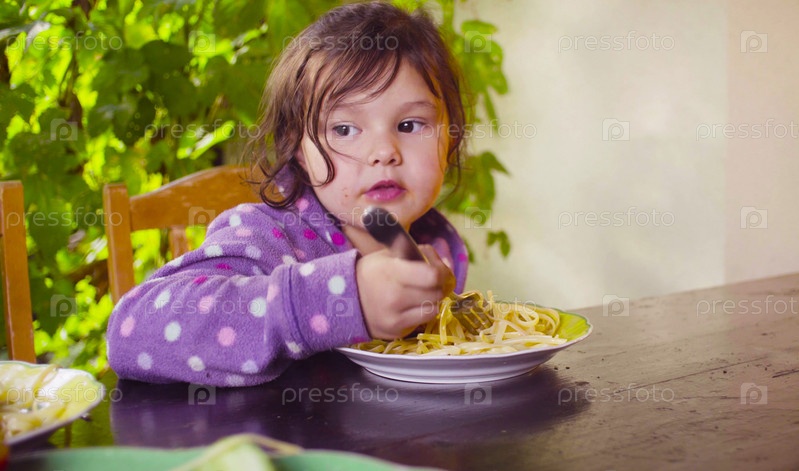 Две непослушные девочки сидят за столом и едят макароны и жареную колбасу