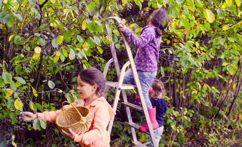 Осенний сад. Две девушки собирают сливы