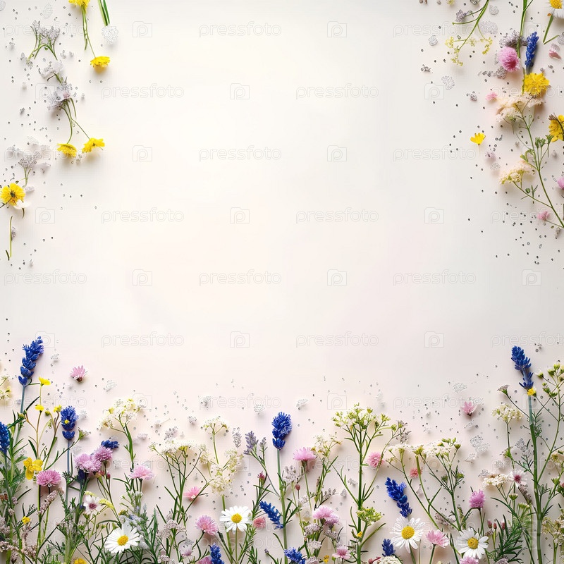 Летний декор из полевых цветов и серебряных искр на светлом фоне