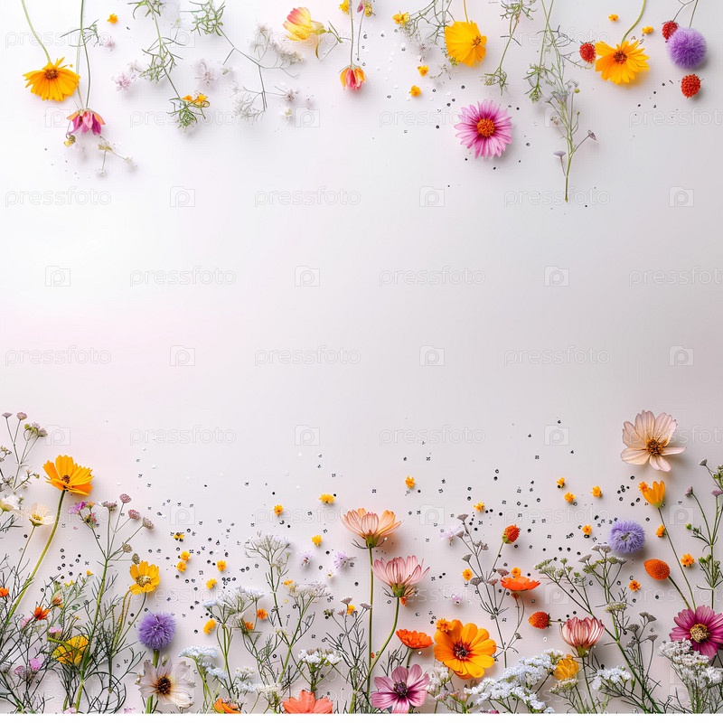 Летний декор из полевых цветов и серебряных искр на светлом фоне