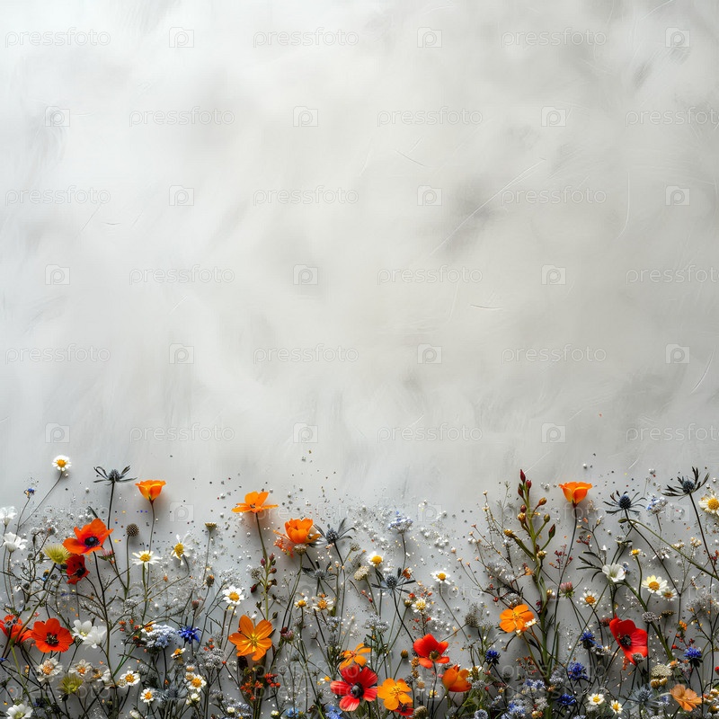 Летний декор из полевых цветов и серебряных искр на светлом фоне