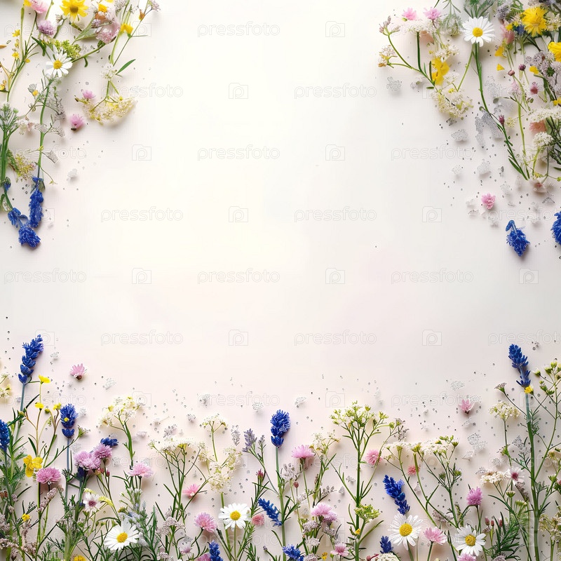 Летний декор из полевых цветов и серебряных искр на светлом фоне