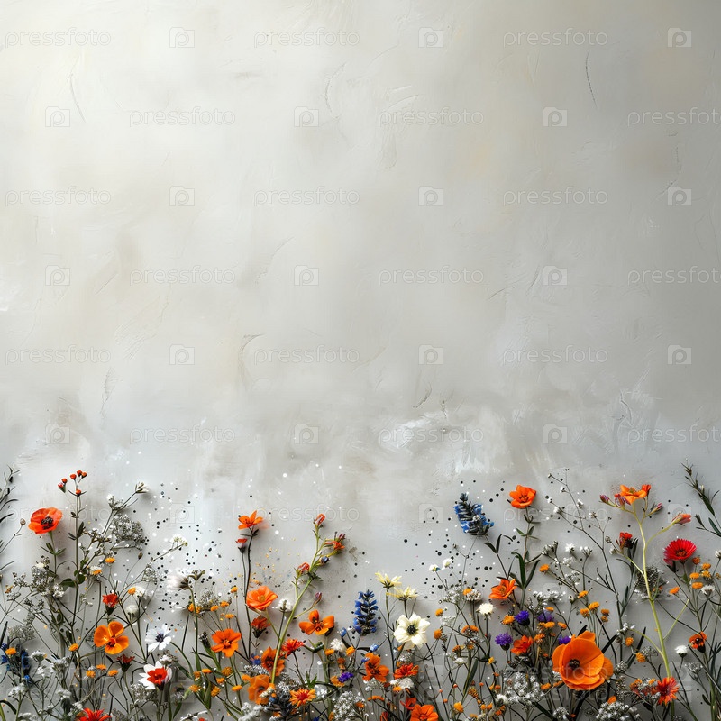 Летний декор из полевых цветов и серебряных искр на светлом фоне