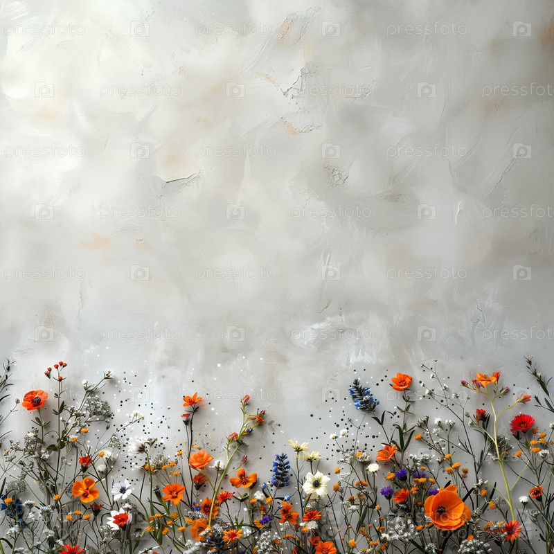 Летний декор из полевых цветов и серебряных искр на светлом фоне