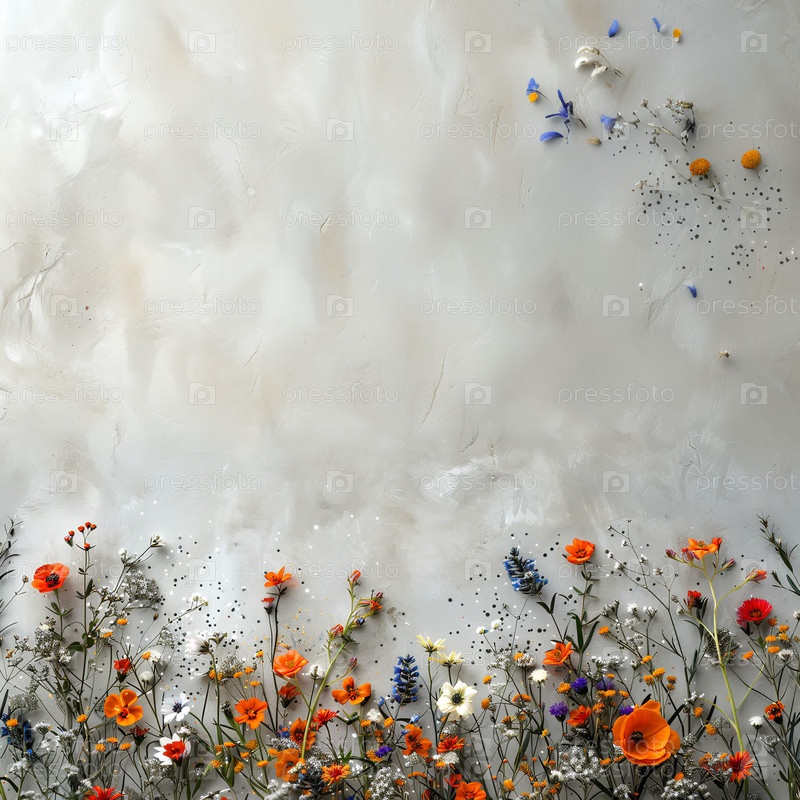 Летний декор из полевых цветов и серебряных искр на светлом фоне