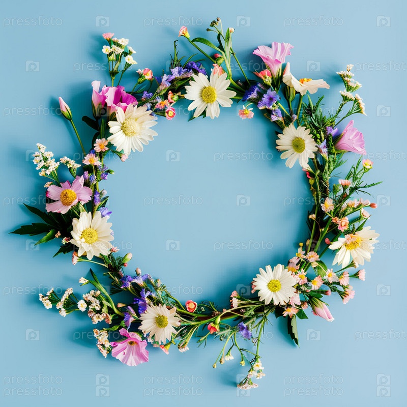 Рамка для текста поздравления с цветами на синем фоне. Открытка в естественных цветах