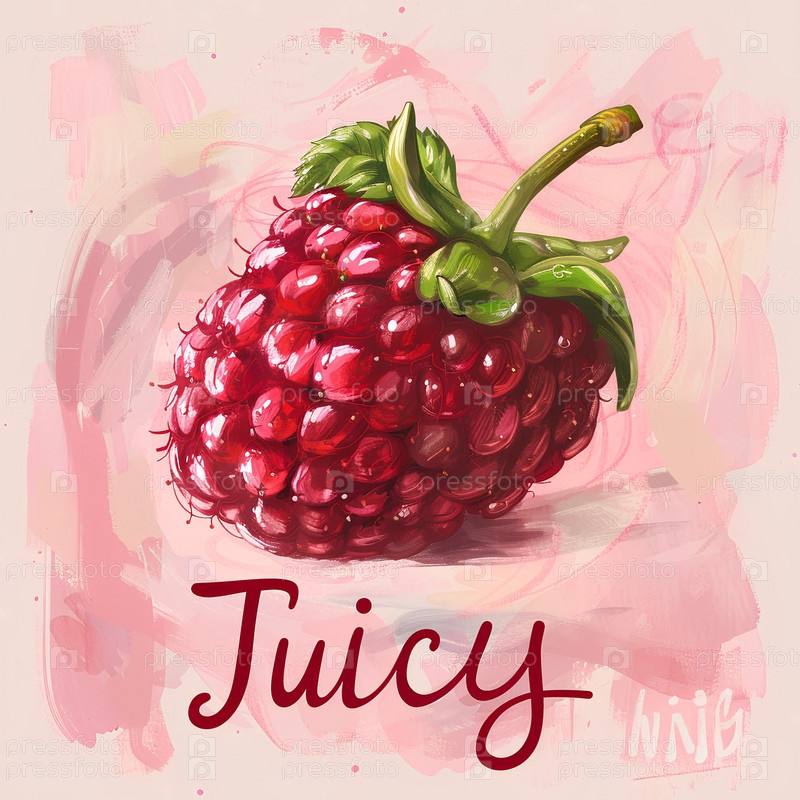 Малиновая ягода на светло-розовом фоне, надпись ниже "Сочная"
