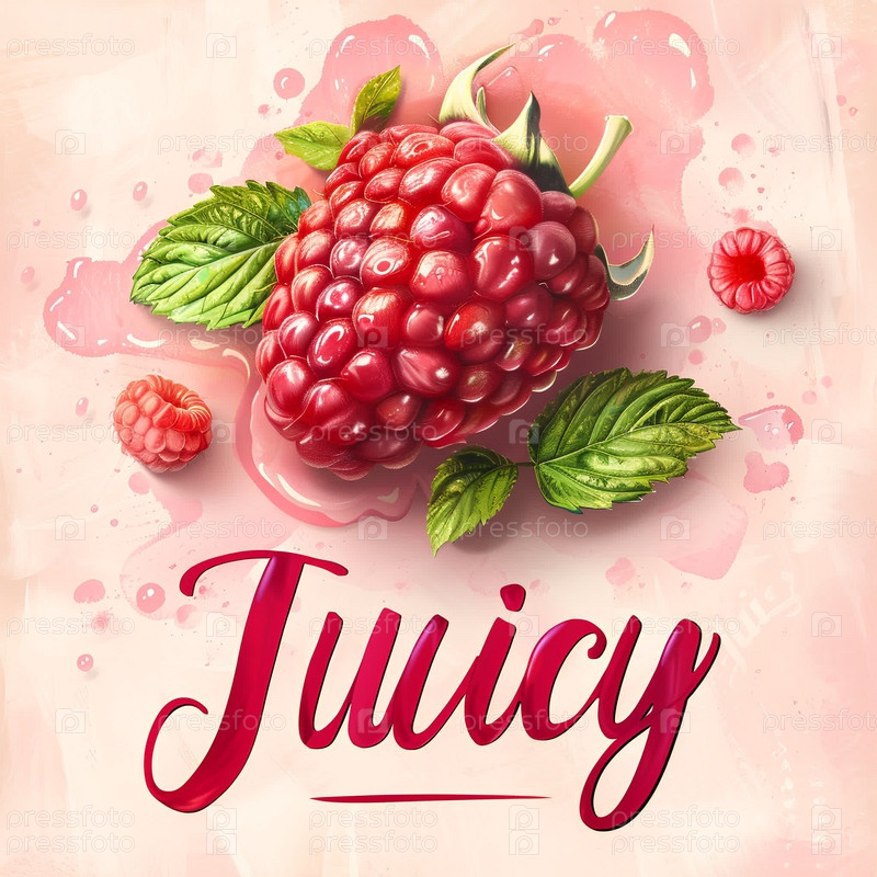 Малиновая ягода на светло-розовом фоне, надпись ниже "Сочная"