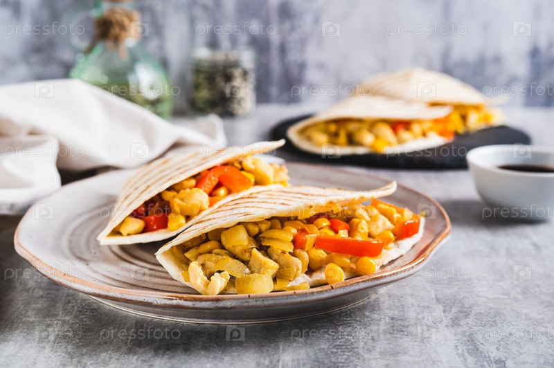 Мексиканская кесадилья с курицей, кукурузой и болгарским перцем на тарелке на столе