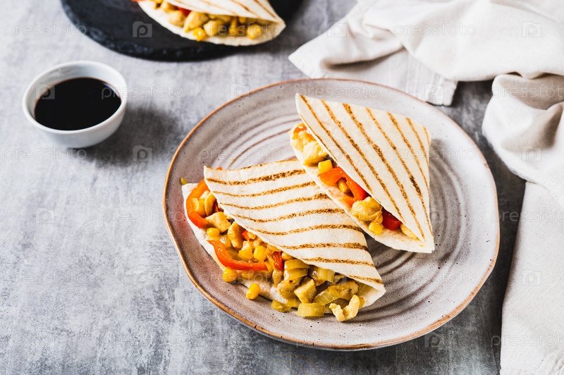 Куриная кесадилья с кукурузой и перцем, завернутая в тортилью на тарелке
