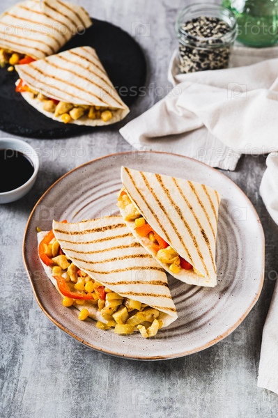 Куриная кесадилья с кукурузой и перцем, завернутая в лепешку, на тарелке, вертикальный вид