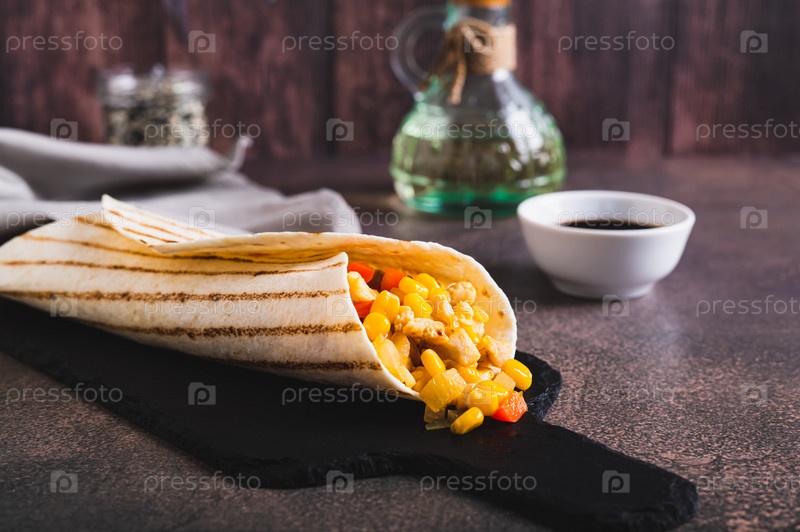 Мексиканское буррито с кукурузой, курицей и перцем в тортилье на грифельной доске