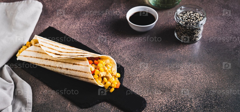 Мексиканское буррито с кукурузой, курицей и перцем в лепешке на грифельной доске веб-баннера