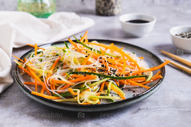 Аппетитный салат из фунчозы, моркови, огурца и кунжута на тарелке на столе