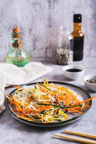 Аппетитный салат из фунчозы, моркови, огурца и кунжута на тарелке вертикального вида