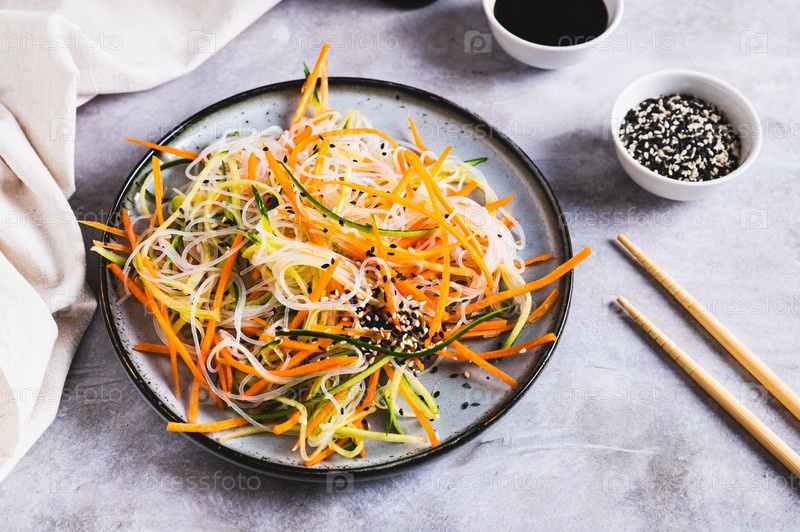 Салат фунчоза со свежим огурцом и корейской морковью на тарелке на столе
