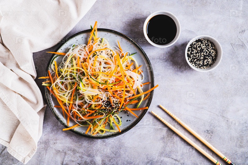 Аппетитный салат из фунчозы, моркови, огурца и кунжута на тарелке на столе