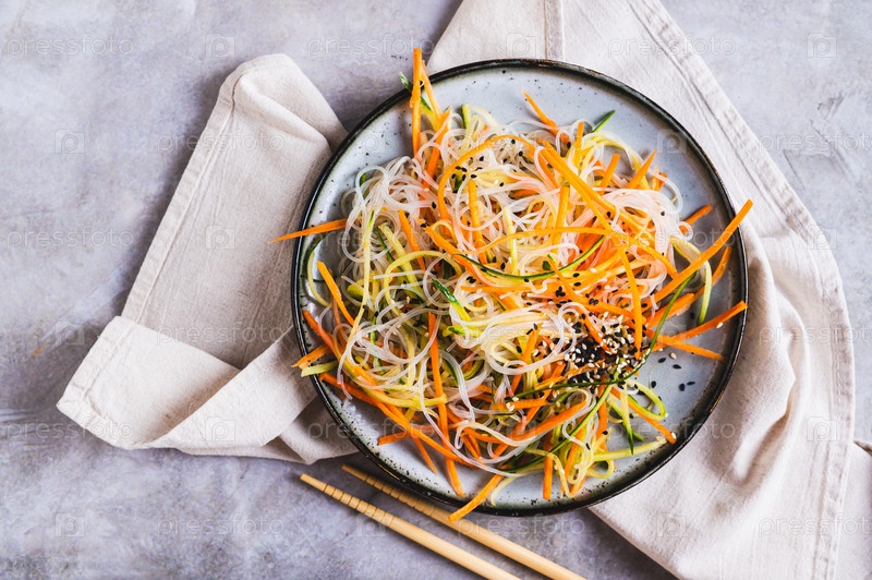 Крупным планом аппетитный салат из фунчозы, моркови, огурца и кунжута на тарелке сверху
