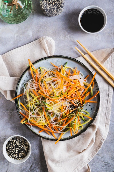 Салат фунчоза со свежим огурцом и корейской морковью на тарелке и вертикальный вид