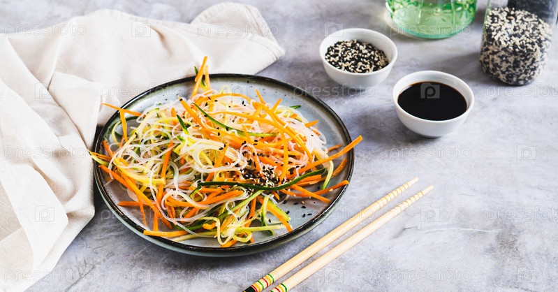 Аппетитный салат из фунчозы, моркови, огурца и кунжута на тарелке веб-баннера
