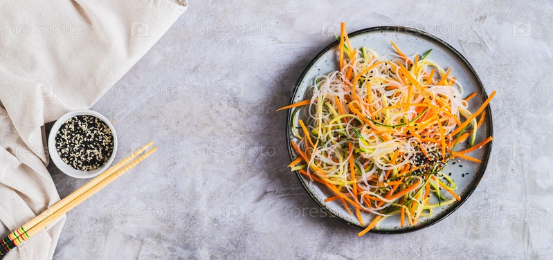 Салат фунчоза со свежим огурцом и корейской морковью на тарелке, вид сверху, веб-баннер
