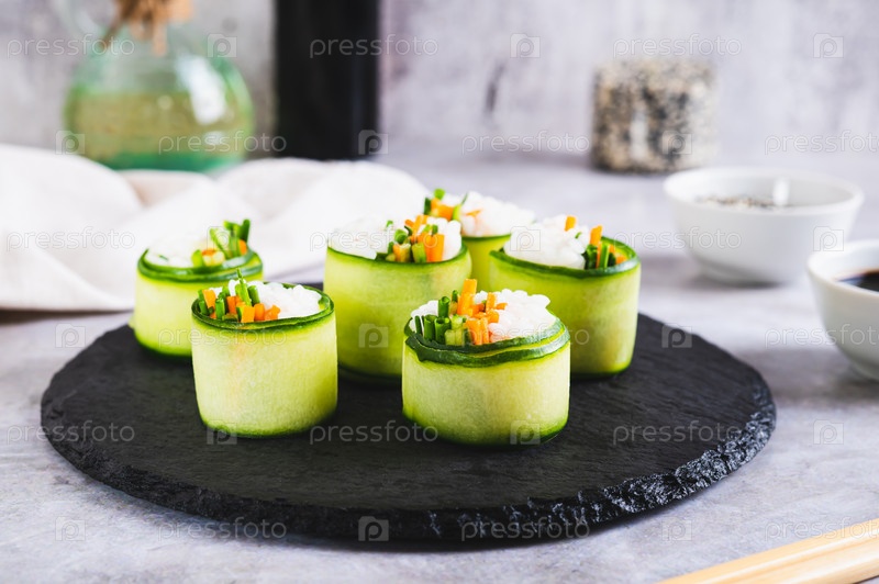 Овощные суши из риса, огурца и моркови на грифельной доске на столе