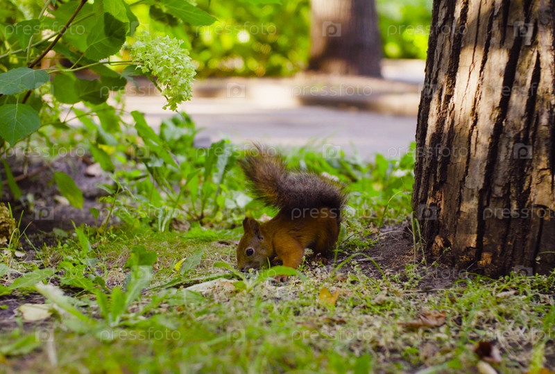 Милая красная белка что-то ест в парке
