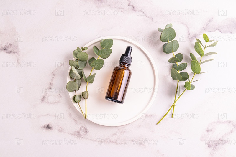 Косметическая бутылка с натуральным средством по уходу за лицом и телом с экстрактом эвкалиптового масла на белом круглом подносе. Мраморный фон. Пустой макет продукта