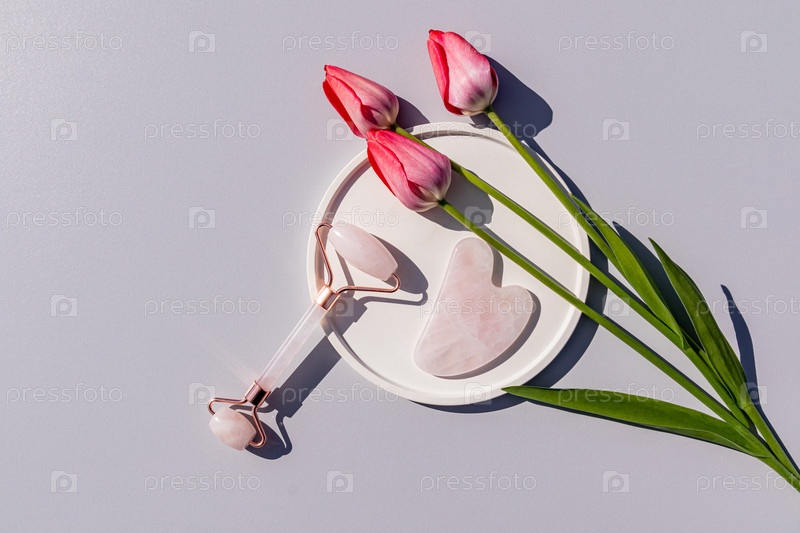 Роликовый массажер из розового кварца, скребок гуаша на белом круглом подносе с живыми тюльпанами. Вид сверху. Серый фон. Лифтинг-массаж, уход за собой