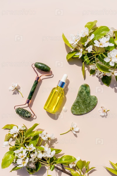 Набор косметического массажера из натурального нефрита и скребка гуа-ша, масла для лимфодренажного массажа на бежевом вертикальном фоне. ветки цветущие