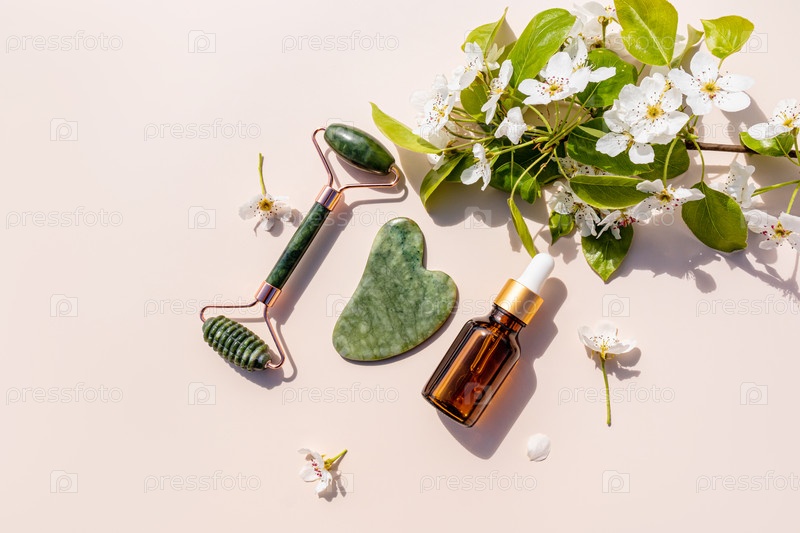 Роликовый массажер из зеленого натурального нефрита, скребок гуаша, косметическое массажное масло во флаконе с капельницей для домашнего массажа лица. Вид сверху