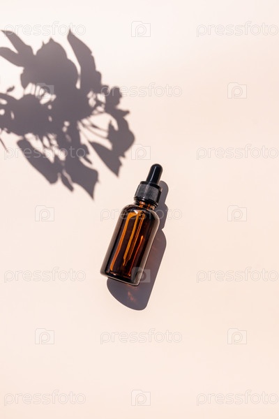 Сыворотка для ухода за кожей лица и тела в косметическом флаконе с капельницей на бежевом фоне с тенью листьев. Вертикальный вид. Копировальное пространство