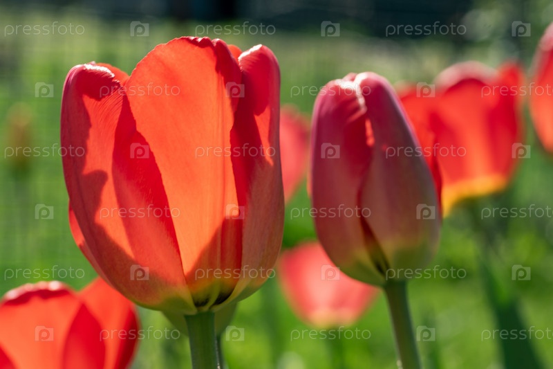 Красные тюльпаны. Пара красных тюльпанов в саду. Весенний размытый фон с яркими тюльпанами. Макро. Тюльпан. Семейство Лилейные. Копировать пространство