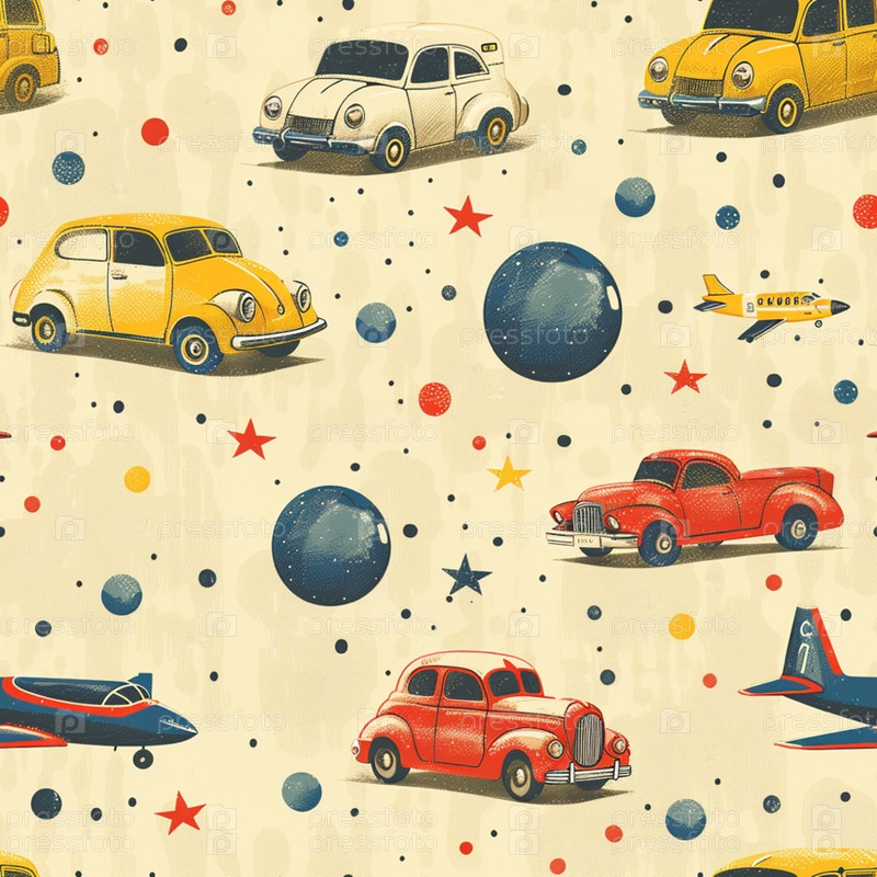Узор в стиле ретро на бежевом фоне: шарики, игрушечные машинки, самолеты, фон или обои и ткань для детской одежды