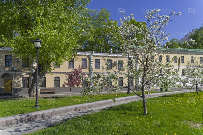 Цветущие яблони на Хитровской площади. Москва, Россия, солнечный день в мае