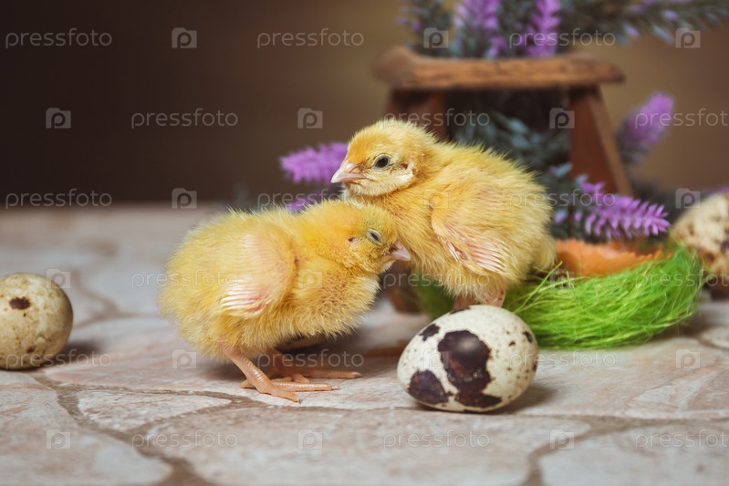 Два милых желтых перепелиных птенца стоят бок о бок, прижавшись друг к другу