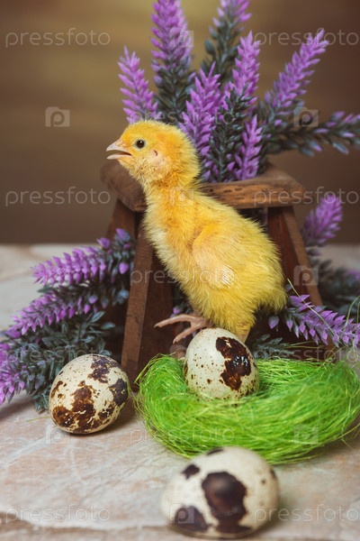 Маленький желтый перепелиный цыпленок стоит, вытянувшись в гнезде, и кричит